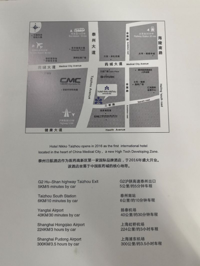 泰州日航酒店地处江苏省泰州市国内首个国家级医药高新区,是进驻泰州医药城的第一家国际品牌酒店。总建筑面积37,580平方米,地上18层、地下1层,拥有含皇家套房、总统套房、公寓房等9种房型在内的200个房间,可以满足国际交流、商务活动、家庭出游等不同消费群体的各种需求。餐饮区有塞丽娜咖啡厅(全日制餐厅)、桃李中餐厅、弁慶日餐厅和大堂吧等4种不同风味的餐厅和酒吧。无柱式多功能宴会厅,8个会议室,以及健身中心、室内恒温游泳池等设施设备为宾客提供全方位的服务。泰州日航酒店是大仓日航酒店管理公司在中国运营的第十二家五星级酒店,由泰州通泰投资有限公司投资建设,由大仓日航酒店管理公司管理运营,位于泰州市医药高新区中国医药城中心部位。该区总规划面积30平方公里,由科学研发区、健康医疗区、教育教学区、综合附带设施区等功能区构成,已有国内外著名大学、医药研发机构,以及众多著名企业进驻。泰州日航酒店毗邻医药会展交易中心,地处数据产业园区,距梅兰芳纪念馆仅20分钟车程,10分钟能抵达泰州南站,距沪陕高速5分钟、扬泰机场30分钟、上海虹桥机场3小时,所处位置交通顺畅,出行便利。