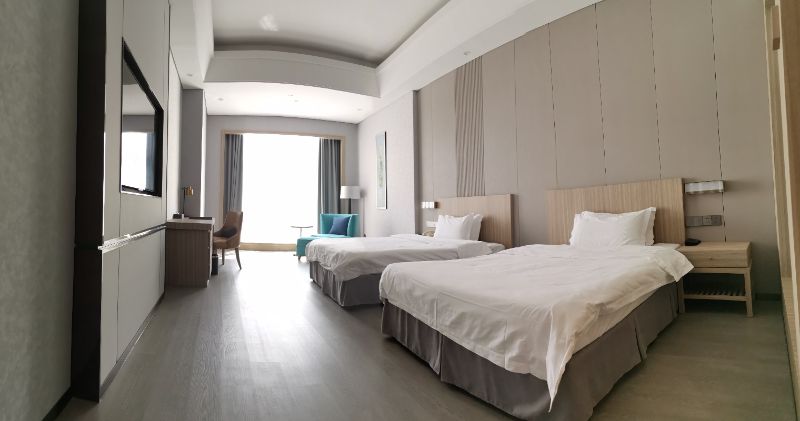 客房量:标间双床(48㎡)配备96间.大床房(48㎡)配备32间.